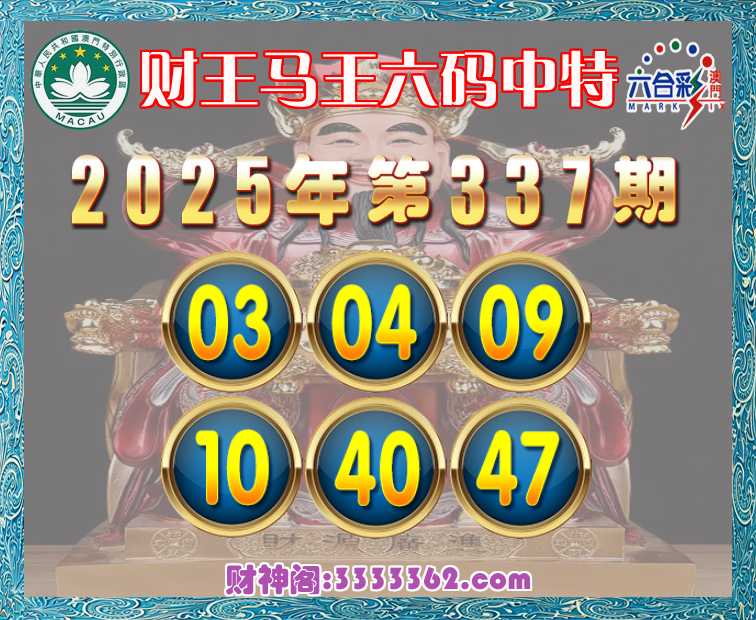 337期:〖财王马王〗 ☘️六码中特☘️【03.04.09.10.40.47】开:09