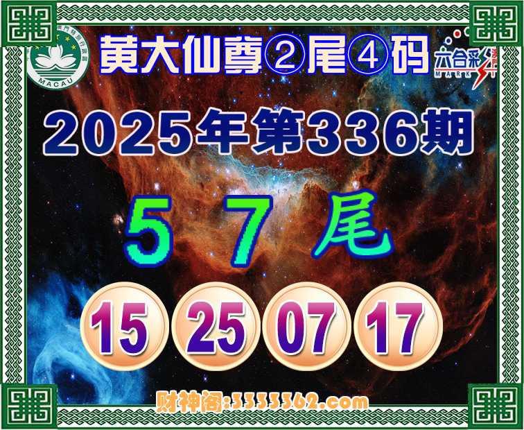 336期:《黄大仙尊》 🎀②尾④码🎀【57尾主:15.25.07.17】开:17