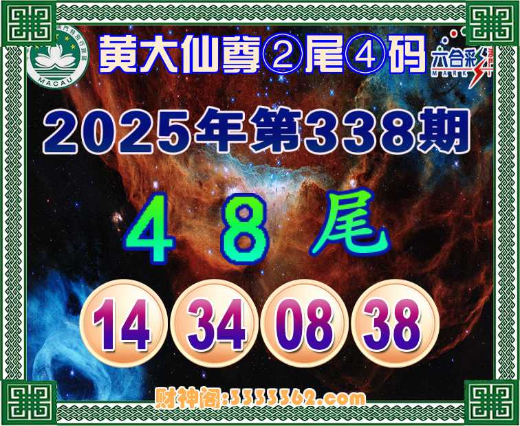338期:《黄大仙尊》 🎀②尾④码🎀【48尾主:14.34.08.38】开:08