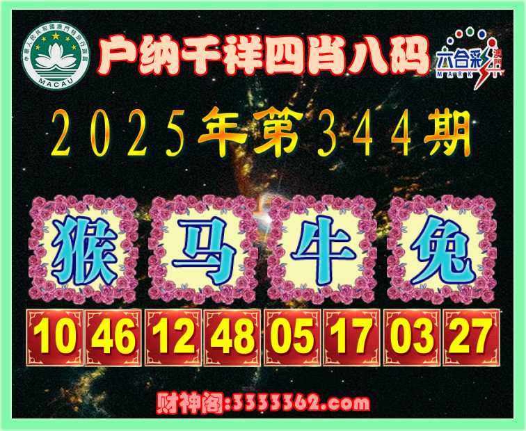 344期:《户纳千祥》 🏇四肖八码🏇【猴马牛兔】开:00准